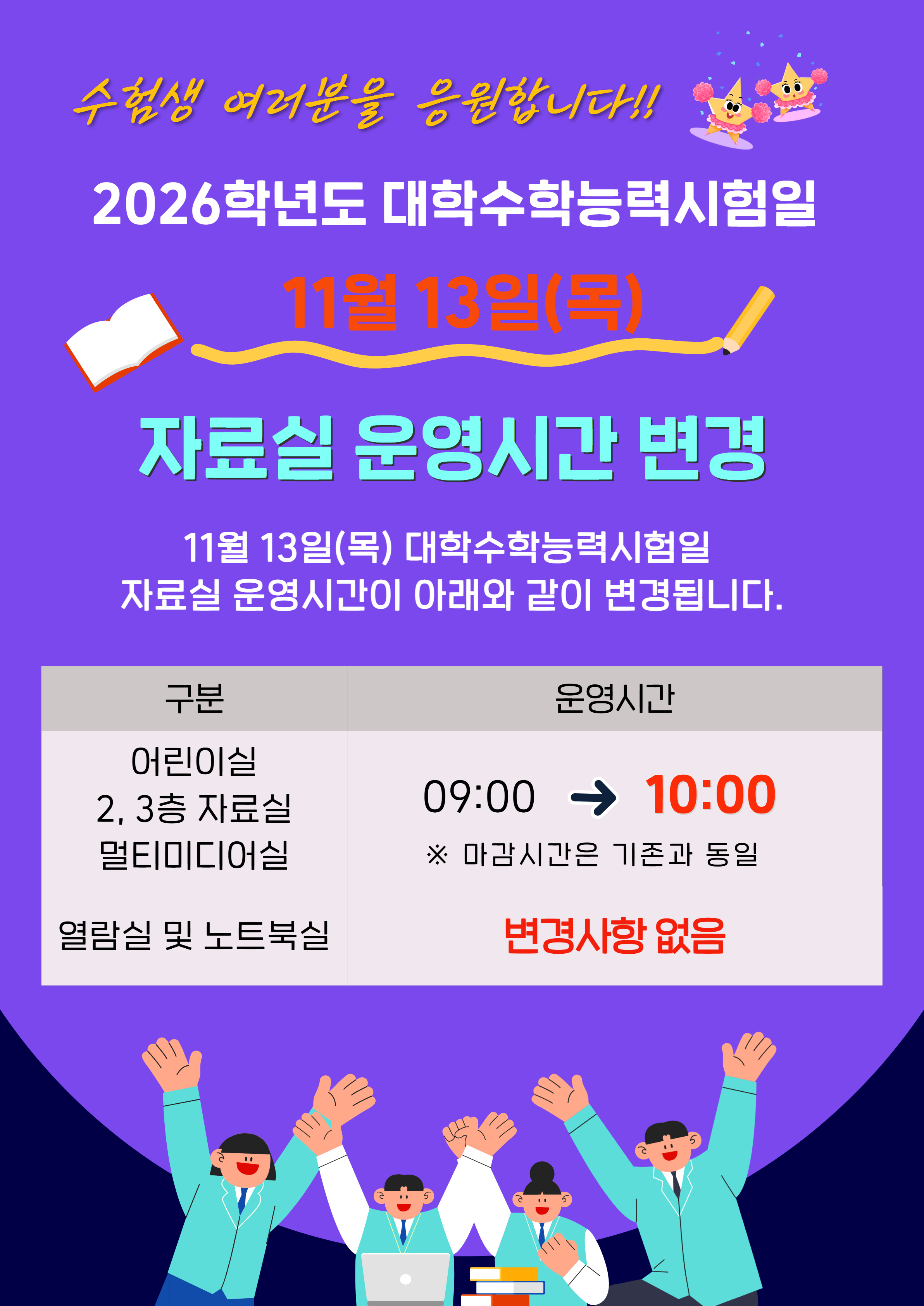 - 2026학년도 대학수학능력시험에 따른 자료실 운영시간 변경 안내