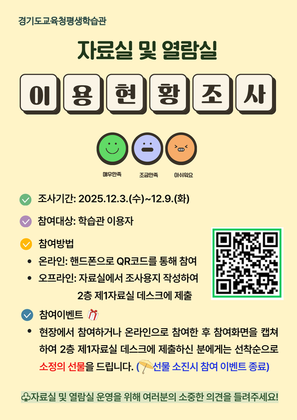 경기도교육청평생학습관 자료실 및 열람실 운영에 대한 이용자 의견 수렴 및 현황을 파악하기 위해 다음과 같이 조사를 실시 합니다. 이용자분들의 많은 참여와 소중한 의견 부탁 드립니다.
