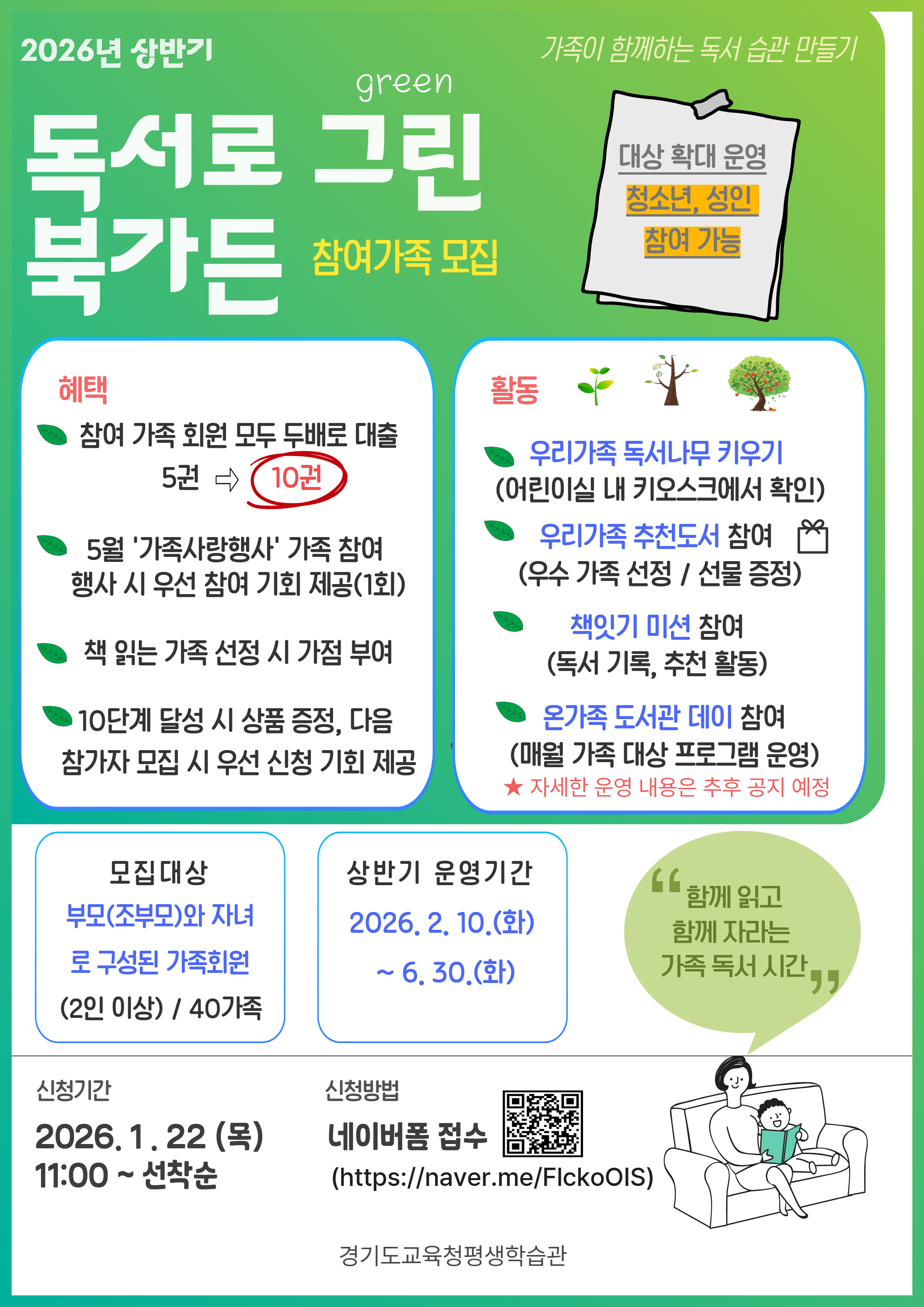 - 2026년 ‘책 읽는 가족(주관: 한국도서관협회)’ 선정 시 가점 부여