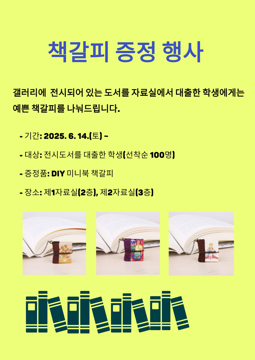 ※ 전시되어 있는 도서를 자료실에서 대출하는 학생에게는 예쁜 책갈피를 나눠드립니다.
