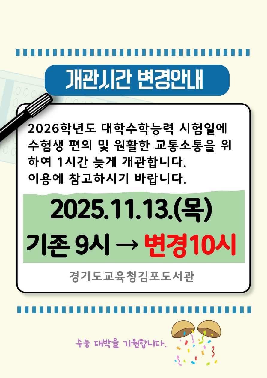 2026학년도 대학수학능력 시험일 수험생 편의 및 원활한 교통소통을 위하여 1시간 늦게 개관합니다.