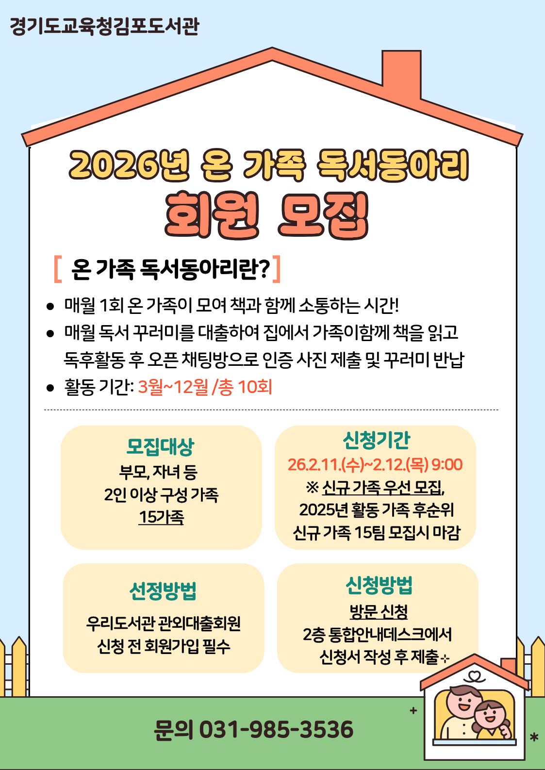 | 이전글 | 2026년 어린이독서회 강사 공개모집 합격자 알림 | 김포도서관관리자 | |