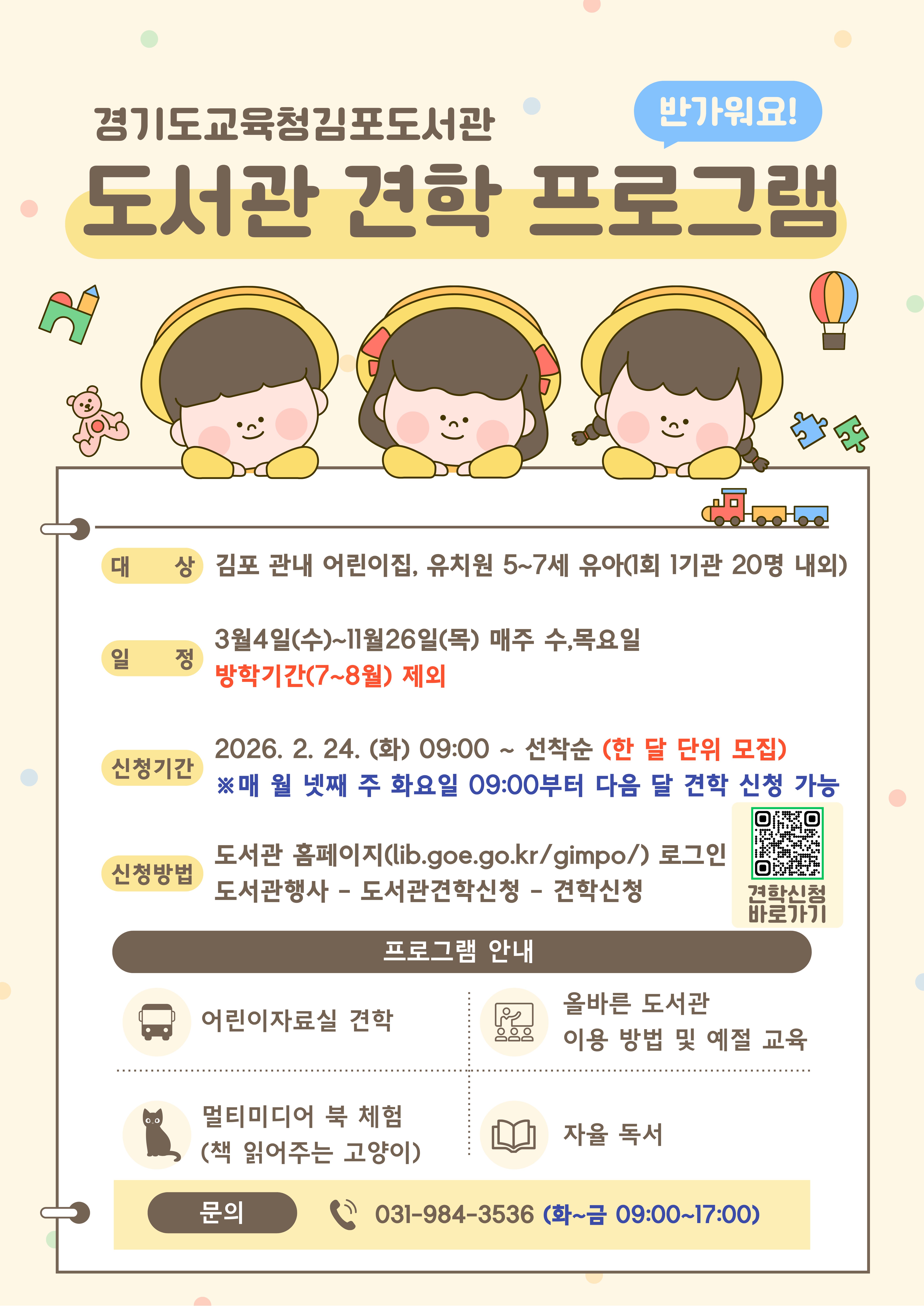 (10108) 경기 김포시 봉화로 68 (사우동, 경기도교육청김포도서관) 전화 031)984-3536, 985-3536 팩스 031)985-3538
