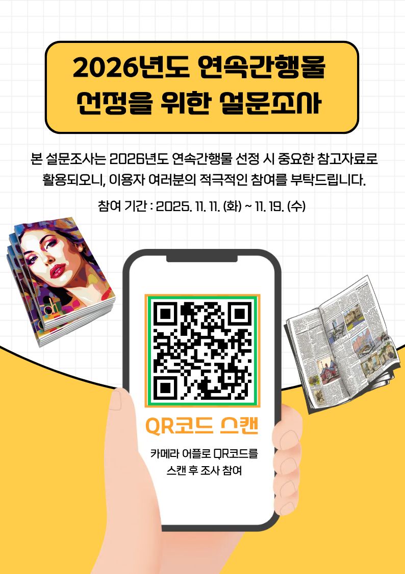 2026년도 연속간행물(잡지, 신문) 선정을 위한 설문조사를 진행합니다.
