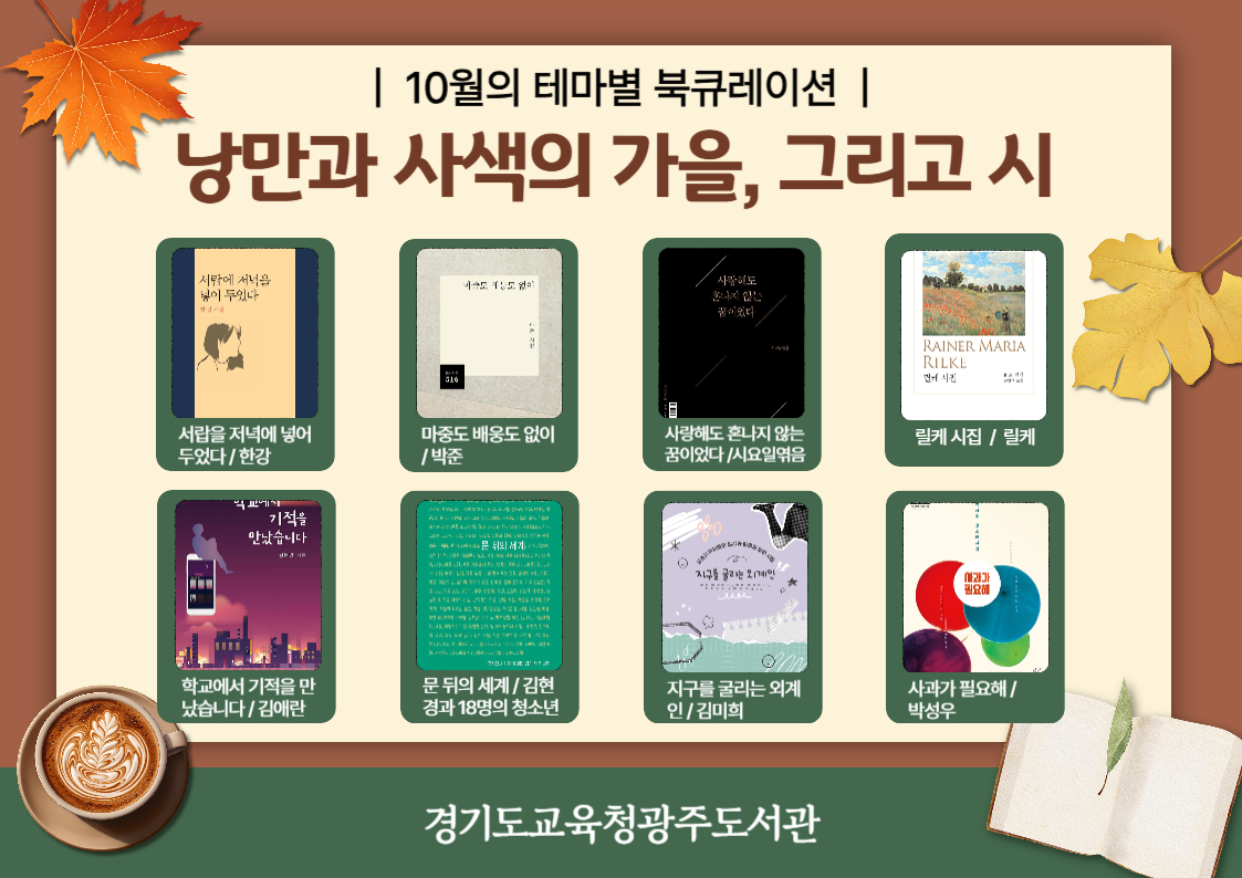 | 이전글 | 경기도교육청평택도서관 2025년 10월 테마가 있는 서가 북큐레이션[온통 가을빛으로 물들다] | 평택도서관관리자 | |